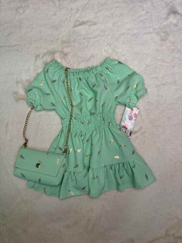 🌿 Mintgroene jurk met gouden veertjes + bijpassend tasje