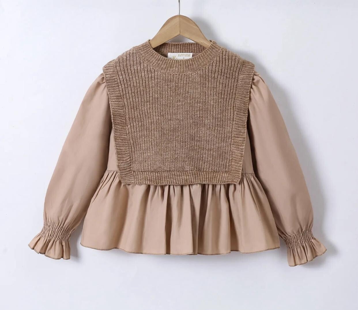 Dit bovenstuk is het perfecte huwelijk tussen stoer breiwerk en elegante flair. De blouse heeft een romantisch geplooide onderkant en pofmouwen, gecombineerd met een speelse, gebreide ‘front overlay’ die doet denken aan een preppy spencer. Warm, stijlvol en super uniek!