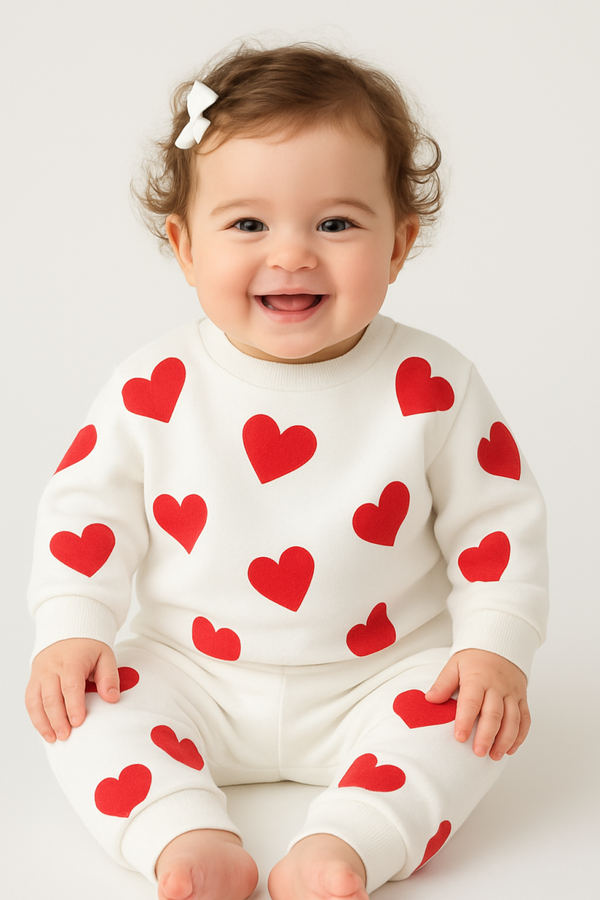 De zachte sweater en comfortabele joggingbroek zijn versierd met vrolijke rode hartjes, perfect voor een speelse en liefdevolle look. Gemaakt van heerlijk zacht materiaal, zodat je kindje zich vrij kan bewegen én er superlief uitziet.