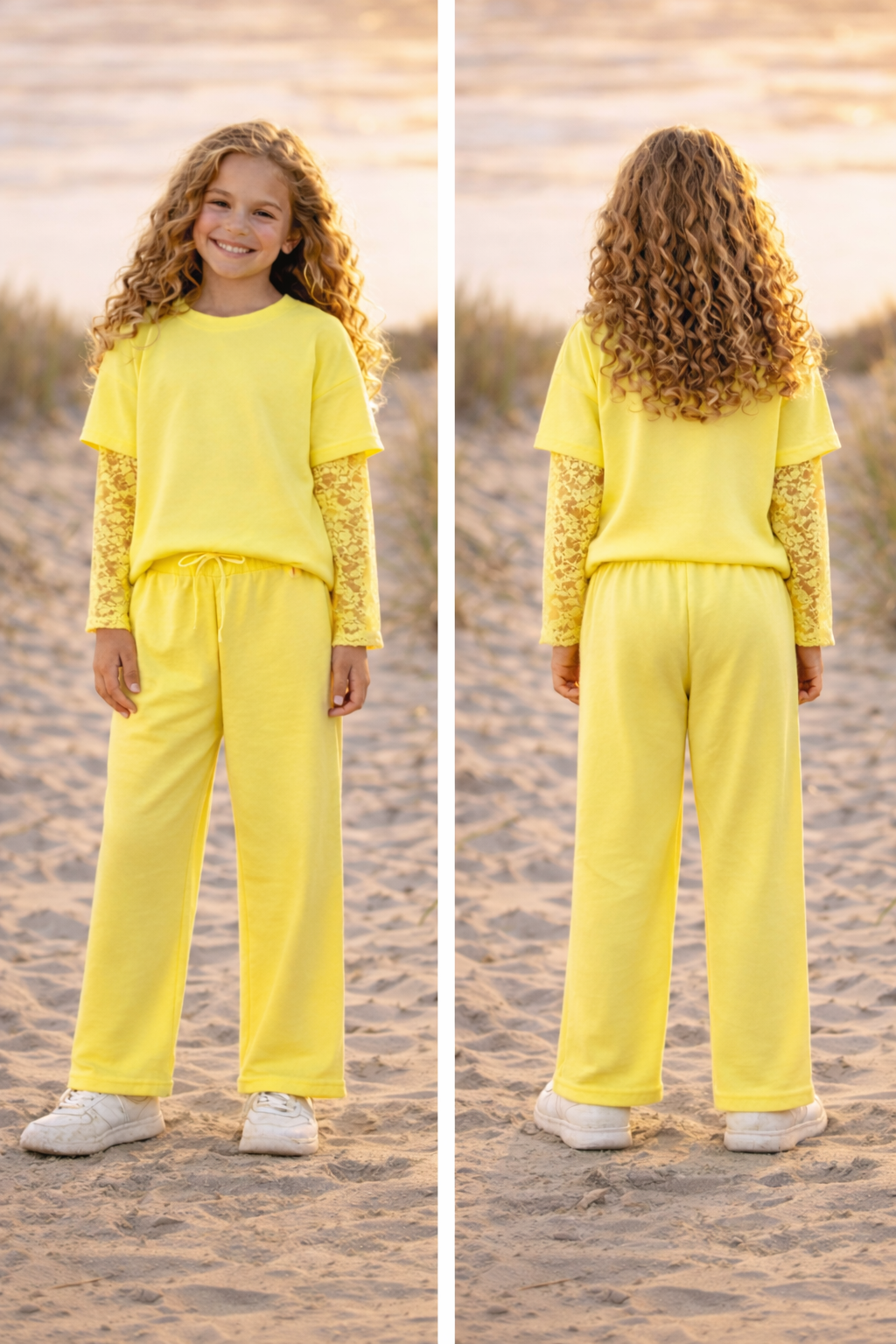 Deze vrolijke Sunny Lace Lounge Set is een echte eyecatcher voor meisjes die houden van comfort én stijl. De set bestaat uit een zachte oversized top met verfijnde kanten lange mouwen en een bijpassende broek met elastische taille en strikkoord.