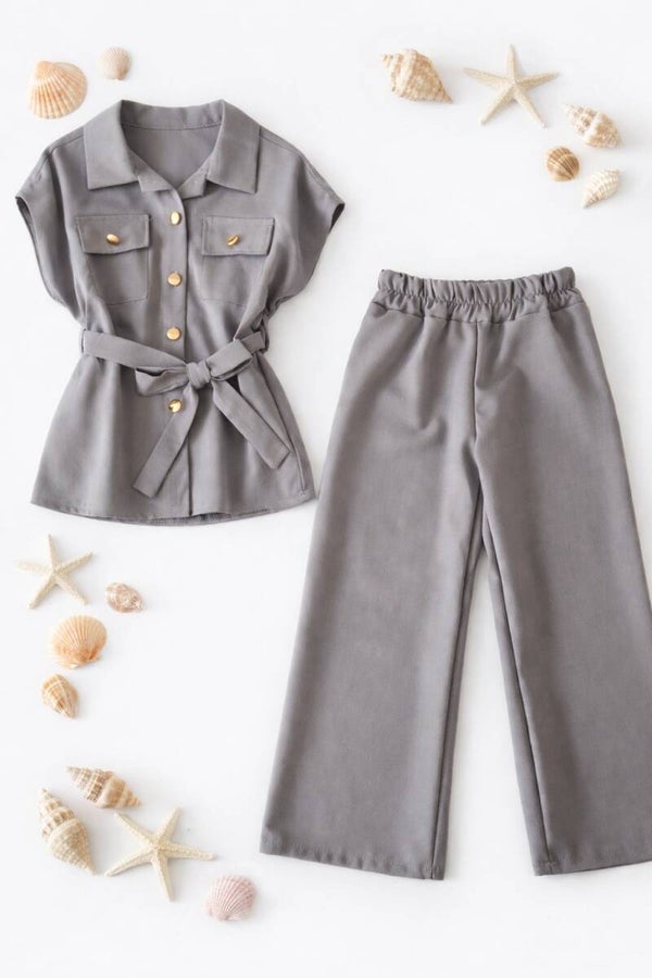 Dit stijlvolle grijze setje voor meisjes is de ideale outfit voor een zonnige dag aan het strand of een casual uitstapje. Het setje bestaat uit een elegante top met gouden knopen en een bijpassende broek die de perfecte combinatie van comfort en stijl biedt. Het riempje in dezelfde kleur maakt de look compleet, terwijl de lichte stof zorgt voor een ademende en comfortabele pasvorm. Het perfecte setje voor actieve meiden die er ook modieus uit willen zien!