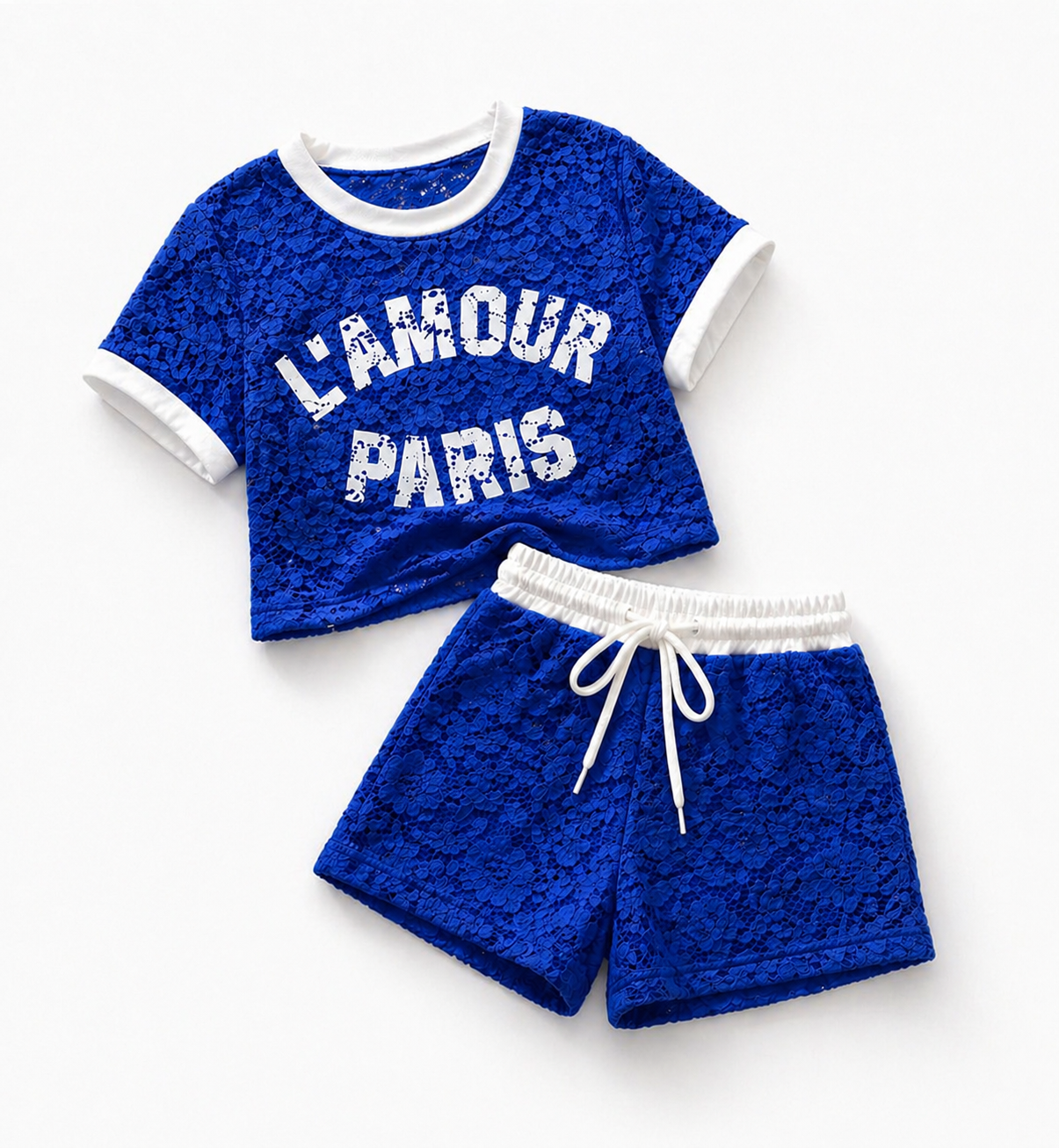 De set bestaat uit een stijlvol T-shirt met de tekst “L’Amour Paris” en een bijpassend shortje met elastische taille en strikdetail. Hierdoor zit de set niet alleen super leuk, maar ook comfortabel.
