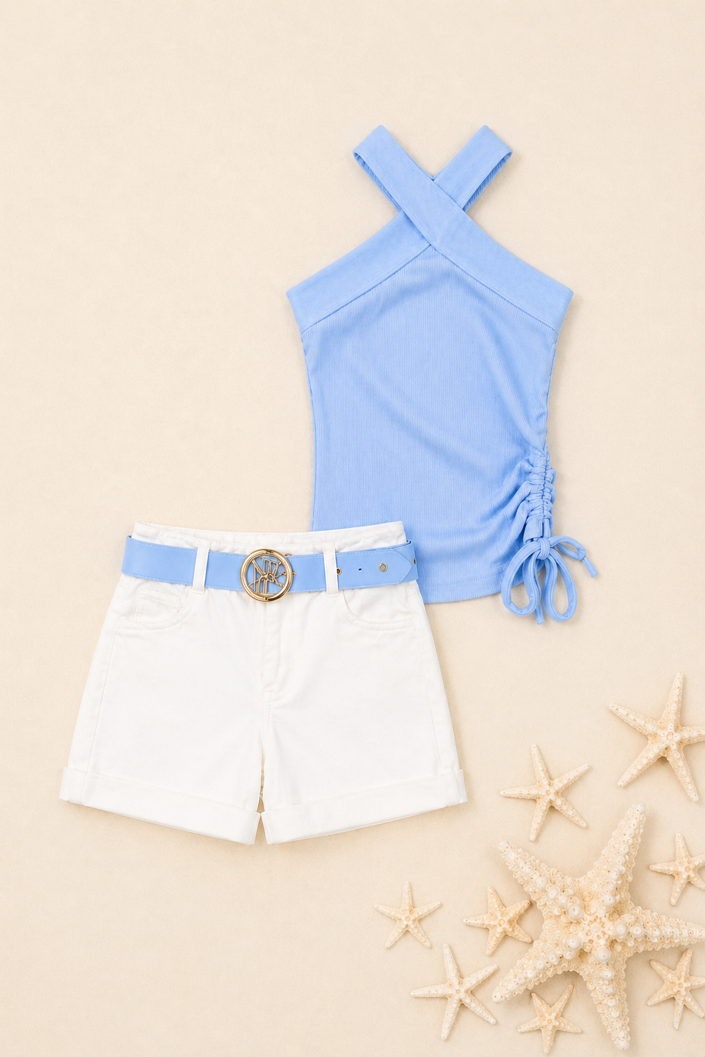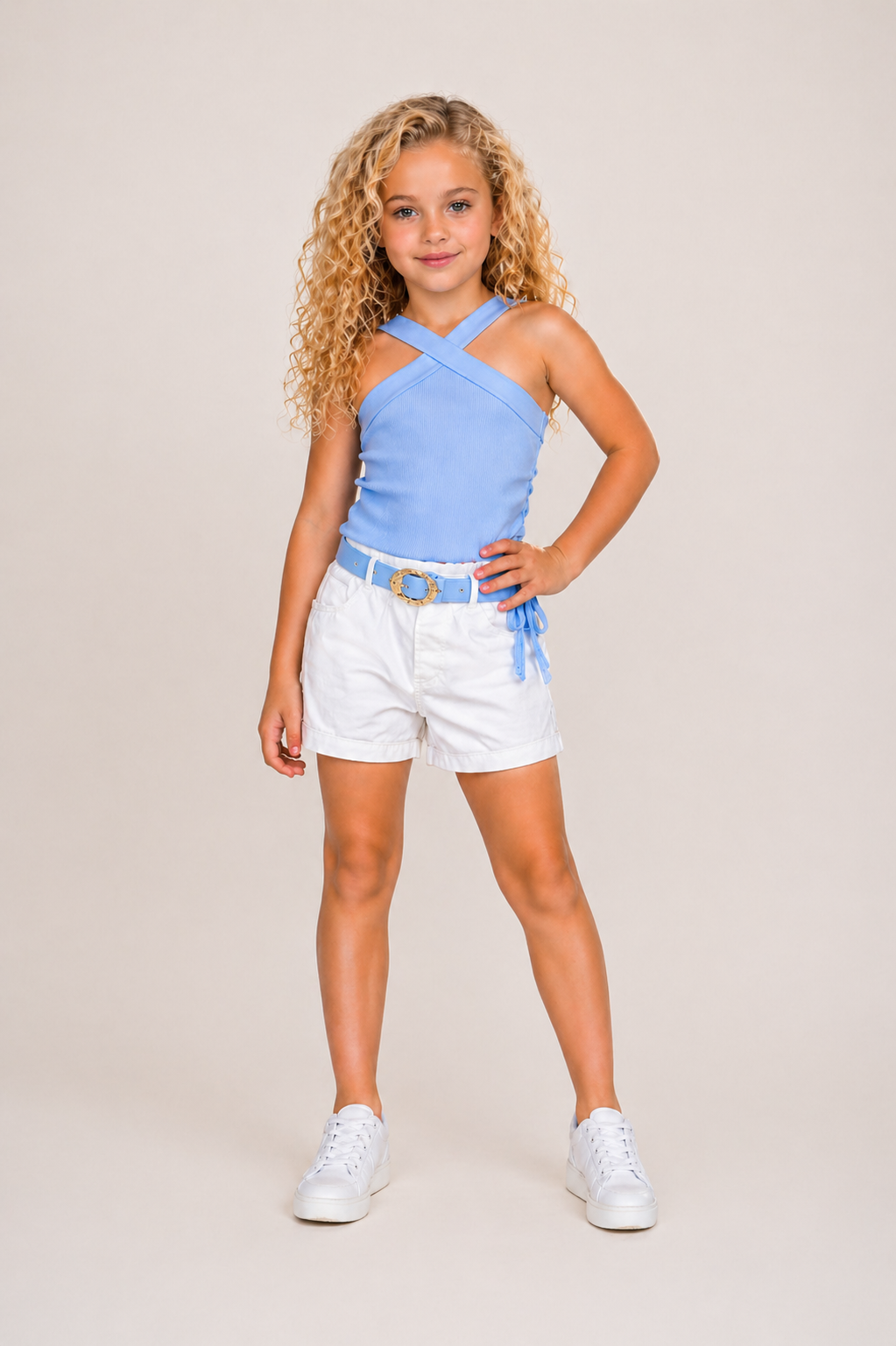 De Rebel Summer Set – is gemaakt voor girls die durven op te vallen. De lieve babyblauw kleurige top met gekruiste bandjes geeft een speelse en edgy vibe, terwijl de wit short zorgt voor een stoere, streetstyle uitstraling. Perfect voor warme dagen, vakanties en elke dag waarop stijl telt.